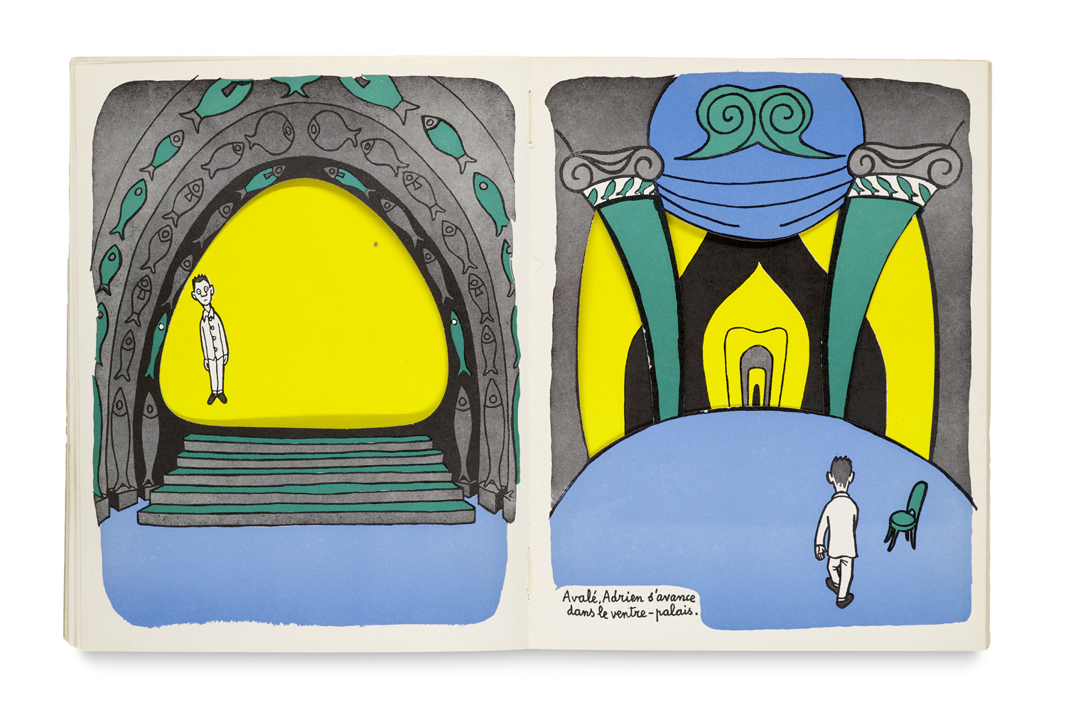Moderne Literatur und Kunst – Selten. - Surrealistisches Bilderbuch mit Illustrationen des französischen Künstlers Maurice Henry. Die farbigen Illlustrationen aus gemischten Drucktechniken zum Teil mit ausgestanzten Flächen, welche so die davor- oder danachfolgende Illustration als Teil des Bildes einbeziehen. - Insgesamt sehr gut erhalten.