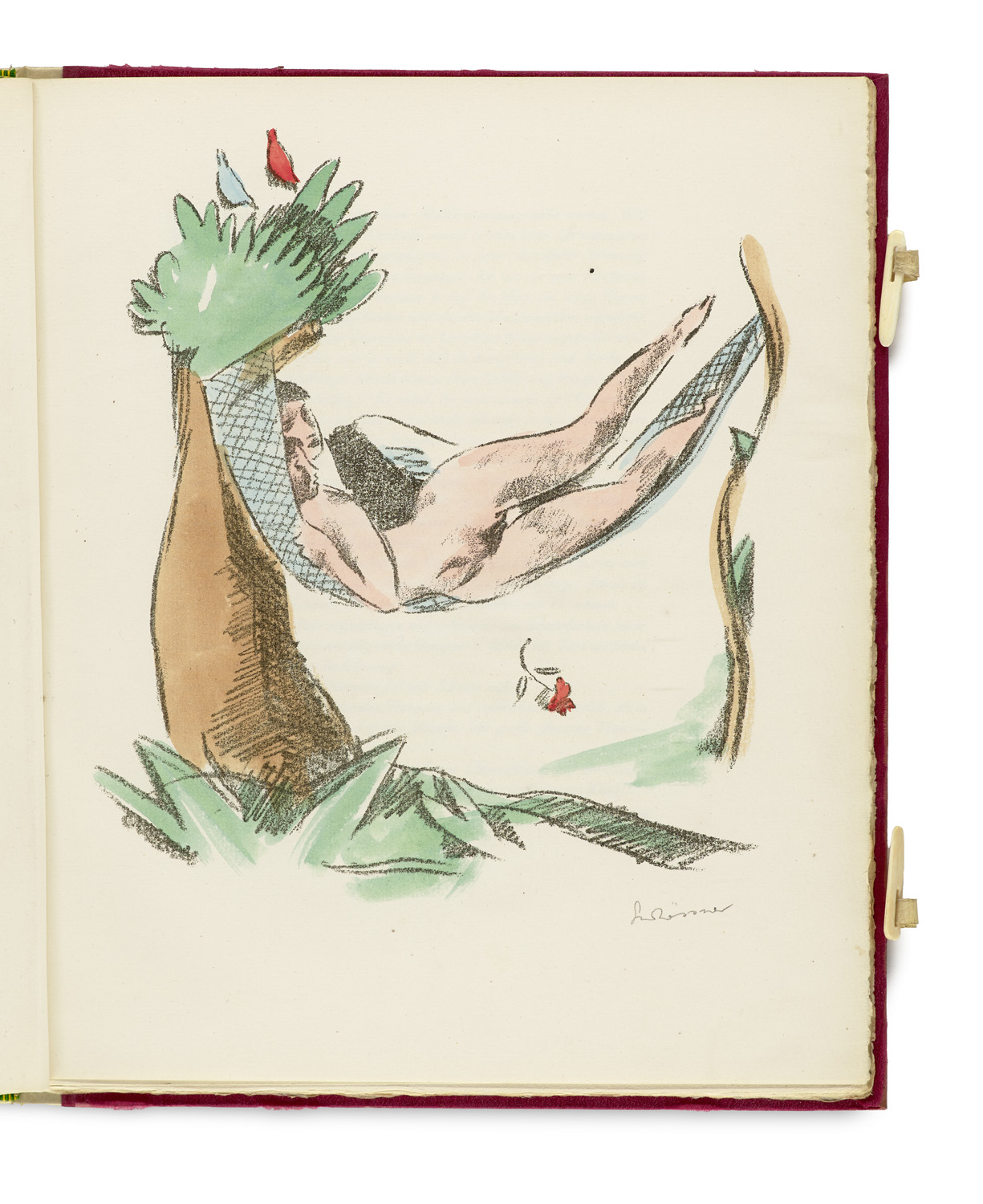 Modern Literature and Art – With 8 hand-colored lithographs by G. W. Rössner. Original half vellum with clasps in cardboard cassette with gold-stamped title (cover slightly loose and partly with small missing pieces, somewhat rubbed and bumped, box heavily rubbed and bumped). - Private prints from the Gurlitt Press. - One of 700 numbered and signed copies. - Overall in good condition.