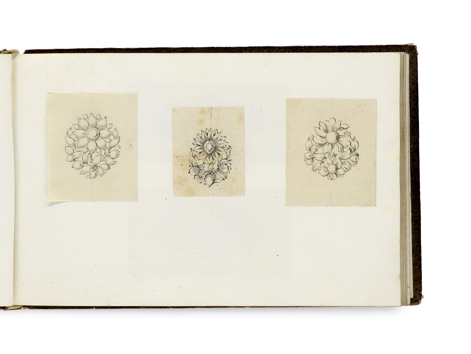 Album mit Entwurfszeichnungen. O. O. u. J. (Frankreich, ca. 1860er-Jahre). Mit ca. 80, davon einigen bezeichnetenm, Schmuckentwürfen in schwarzer Feder und Bleistift mit teils grauer Lavierung auf 69, meist kleinen Blättern verschiedener Größe und Papierart, diese montiert auf 49 weißen Blättern Vélin. Quer-8° (22,5 x 14,6 cm). Maroquinbd. d. Zt. mit dekorativer Gold- und Blindpräg. unter Einschluss von teils mehrfachen Filetenrahmen mit Rocaille-Dekor, sowie Flecht- und Rankenwerk, die Vorsätze aus blindgepr. gewachstem Buntpapier, umseitiger Goldschnitt (Rücken, Kapitale, Ecken und Kanten stärker, Deckel gering beschabt).