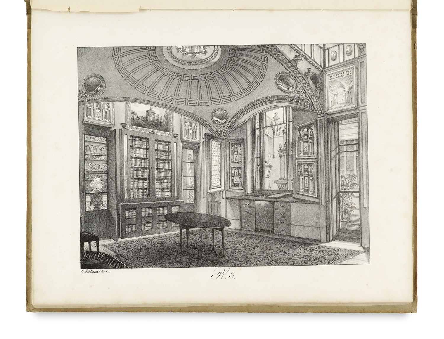 Description of the House and Museum on the North Side of Lincoln's-Inn-Fields, the Residence of John Soane. Mit 17 lithogr. Tafeln und Grundrissen. London, Moyes, 1830. Gr.-4°. 2 Bll., 56 Seiten. OPp. mit Deckelschild (etwas fleckig und beschabt, Rücken erneuert).