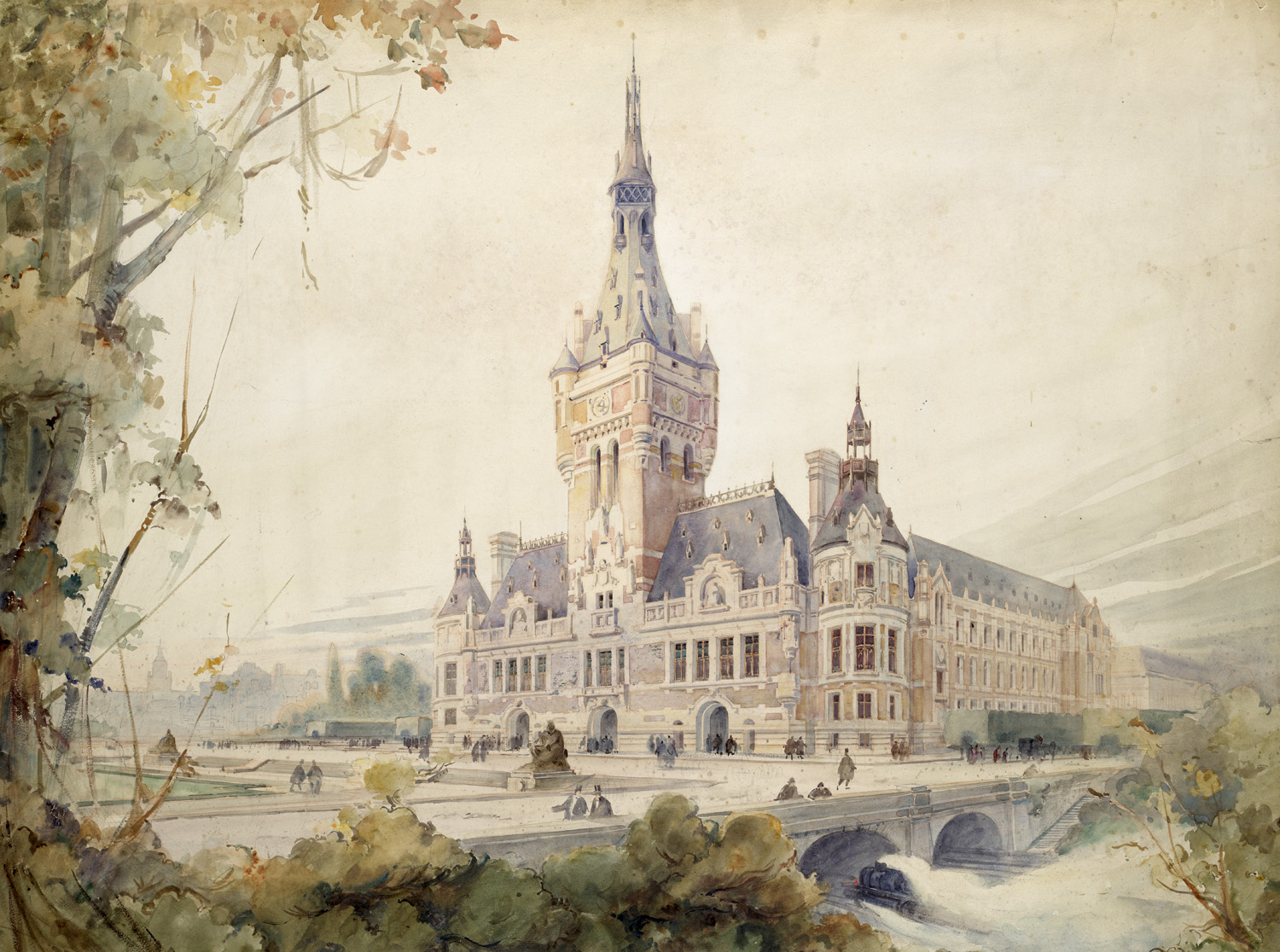 Architektur – Ansicht eines repräsentativen Baus mit hoch aufragendem Turm in wirkungsvoller, leicht erhöhter Perspektive. Die Architektur ist axial-symmetrisch aufgebaut und durch einen stark betonten Mittelteil beherrscht. Die regelmäßig gegliederten Seitenflügel, die klare Achsordnung und die hohen Dachzonen entsprechen dem Typus repräsentativer französischer Profanarchitektur. Die feine, differenzierte Aquarellierung arbeitet die Fassadengliederung und den Baukörper klar heraus. Gerahmt und kontrastiert wird das Motiv zu beiden Seiten von locker gesetzten Baumpartien. - Vereinzelt mit leichten Braunflecken und kleineren Altersspuren. Leicht gegilbt und knickspurig. Ecken leicht bestoßen. Ränder vereinzelt mit kleinen Einrissen. Links oben Ecke mit Knick. Links unten ein kaum merkliches kleines Loch. Insgesamt hervorragent. Ein atmosphärisches Aquarell mit feiner Farbgebung.