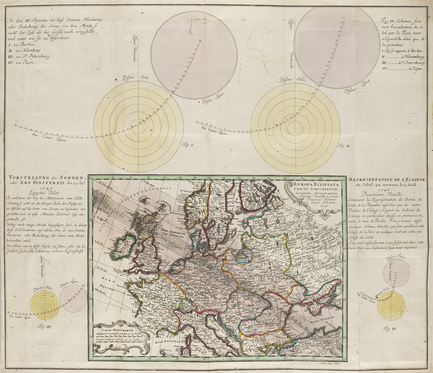 Kurze Erklärung über zwey Astronomische Karten von der Sonnen- oder Erd-Finsternis den 25. Julius 1748. zu derselben deutlicher Einsicht und bequemen Gebrauch bey künfftiger Wahrnehmung dieser Himmels-Begebenheit : denenjenigen zu Liebe, die der Astronomie nicht kundig sind... Mit 2 großform. gest., gefalt. und kolor. Karten und einer gest., gefalt. und kolor. Tafel. Nürnberg, Homann, 1748. 24 S. 8°. Pp. d. Zt. mit hs. RTitel (etwas berieben, bestoßen und fleckig.)