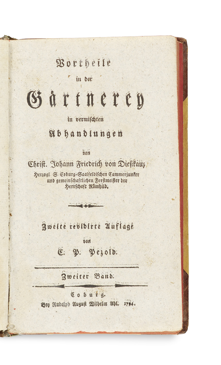 Vortheile in der Gärtnerey in vermischten Abhandlungen. Zweite revidierte Auflage von E. P. Pezold. Coburg, Rudolph August Wilhelm Abl, 1794. (5) Bll., 413 S., (3) Bll., 414 S. Hldr. d. Zt. mit zwei goldgeprägten Rückenschildern und RVergold.