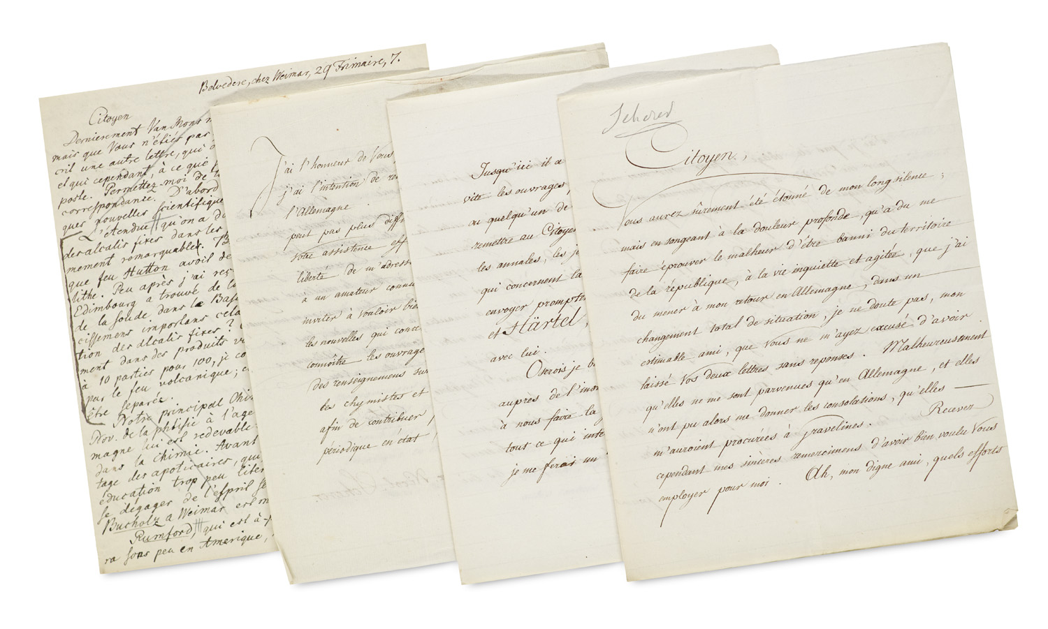 Sammlung von drei eigenhändigen Briefen mit Unterschrift des deutsch-russischen Chemikers (1772-1824) an den Chemiker u. Politiker Louis-Bernard Guyton de Morveau (1737-1816) in Paris. Französische Handschrift auf Bütten u. Papier. Belvedere in Weimar, 1798/1799. Insg. 20 beschr. S. auf 5 Doppelblättern (Einzelblattmaße ca. 22,5 x 18,3 cm).